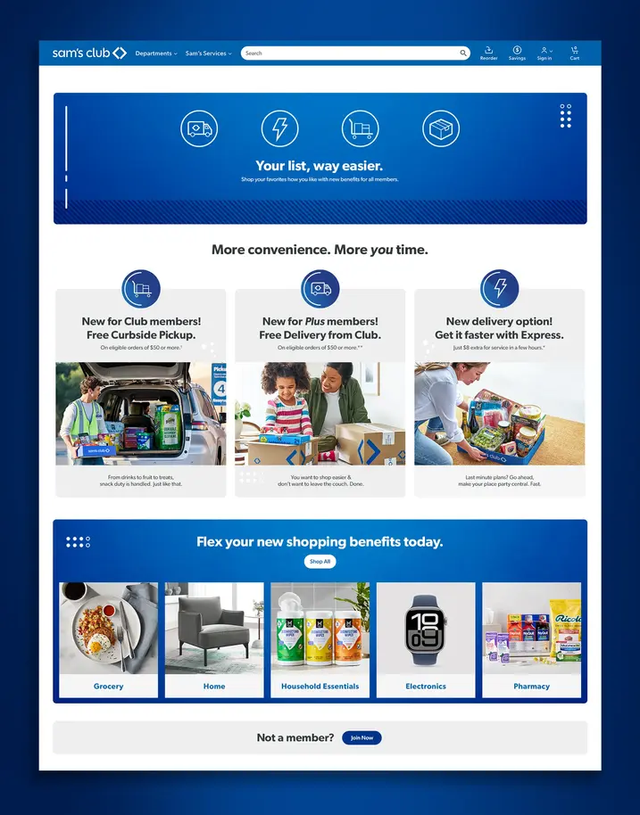 The Shop Your Way campaign was designed to raise awareness of Sam’s Club convenience services like Club Pickup, Delivery from Club, Shipping, and Express Delivery. To highlight these benefits, I created a landing page, emails, onsite banners, and assets for paid search and affiliate partners. Using simple iconography and strong imagery, the campaign drove digital engagement, boosted membership growth, and improved retention by helping members better understand the value of their benefits.